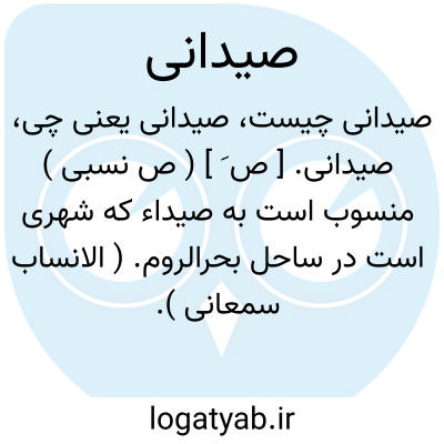 لغت نامه دهخدا صیدانی. [ ص َ ] ( ص نسبی ) منسوب است به صیداء که شهری است در ساحل بحرالروم. ( الانساب سمعانی ).