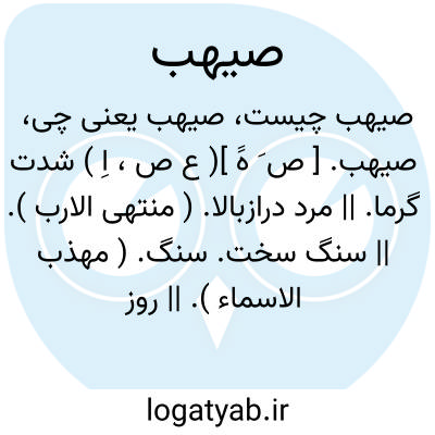صیهب. [ ص َ هََ ]( ع ص، اِ ) شدت گرما. || مرد درازبالا. ( منتهی الارب ). || سنگ سخت. سنگ. ( مهذب الاسماء ). || روز گرم. ( منتهی الارب ). روزی سخت گرم. ( مهذب الاسماء ). || جای سخت. || زمین هموار و سنگستان و جائی که آفتاب بر آن بحدی تابد که گوشت بر آن بریان توان کرد. ( منتهی الارب ).
