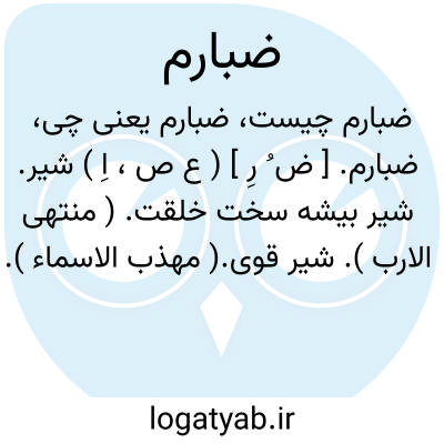 لغت نامه دهخدا ضبارم. [ ض ُ رِ ] ( ع ص، اِ ) شیر. شیر بیشه سخت خلقت. ( منتهی الارب ). شیر قوی.( مهذب الاسماء ). || مرد توانا و دلاور دشمن کش. ( منتهی الارب ). مرد دلیر. ( مهذب الاسماء ). ضُبارمة، مثله فی الکل، و قیل المیم زائدة. ( منتهی الارب ).