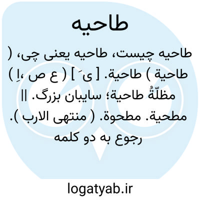 ( طاحیة ) طاحیة. [ ی َ ] ( ع ص،اِ ) مظلّةُ طاحیة؛ سایبان بزرگ. || مطحیة. مطحوة. ( منتهی الارب ). رجوع به دو کلمه اخیر شود.
