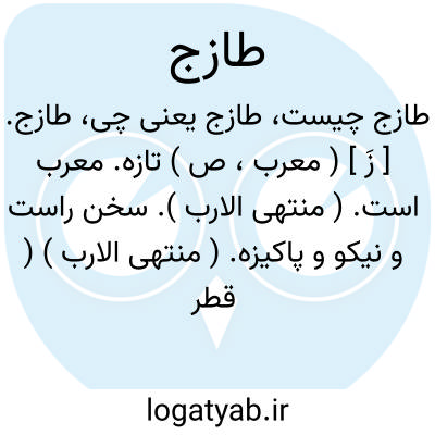 لغت نامه دهخدا طازج. [ زَ ] ( معرب، ص ) تازه. معرب است. ( منتهی الارب ). سخن راست و نیکو و پاکیزه. ( منتهی الارب ) ( قطر المحیط ). || خالص از هر چیزی. ( منتهی الارب ).