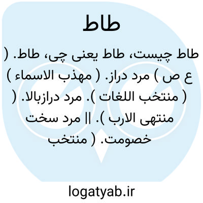 طاط. ( ع ص ) مرد دراز. ( مهذب الاسماء ) ( منتخب اللغات ). مرد درازبالا. ( منتهی الارب ). || مرد سخت خصومت. ( منتخب اللغات ). || مرد متکبر. ( اقرب الموارد ). || دلاور. ( منتهی الارب ). شجاع. ( اقرب الموارد ). مرد دلیر. ( منتخب اللغات ). || گشن تیزشهوت. ( منتهی الارب ). گشن با بانگ. ( منتهی الارب ). شتر مست. ( مهذب الاسماء ). شتر نر که برای گشنی مست شده باشد. ( منتخب اللغات ). ج، اطواط.