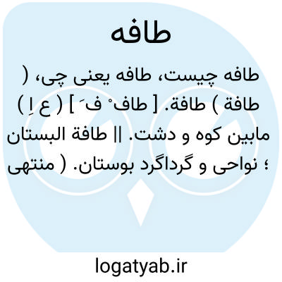 ( طافة ) طافة. [ طاف ْ ف َ ] ( ع اِ ) مابین کوه و دشت. || طافة البستان؛ نواحی و گرداگرد بوستان. ( منتهی الارب ).