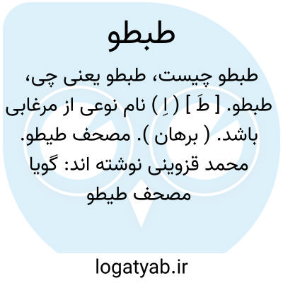 طبطو. [ طَ ] ( اِ ) نام نوعی از مرغابی باشد. ( برهان ). مصحف طیطو. محمد قزوینی نوشته اند: گویا مصحف طیطو باشد. رجوع به طیطو شود.