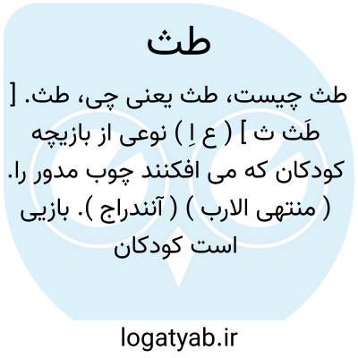 لغت نامه دهخدا طث. [ طَث ث ] ( ع اِ ) نوعی از بازیچه کودکان که می افکنند چوب مدور را. ( منتهی الارب ) ( آنندراج ). بازیی است کودکان را. و آن چنان است که چوبی مدور میاندازند، و از هم میربایند، و آن چوب را مطمثه گویند. ( منتخب اللغات ). چکز.