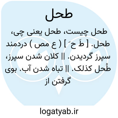 طحل. [ طَ ح ِ ] ( ع ص ) خشمناک. || پُر. || آب چغزلاوه برآورده. || سیاه. || رجُل ٌ طحل؛ مرد کلان سپرز. مرد دردمندسپرز مطحول. || شراب ٌ طَحِل؛ شراب نه تیره نه روشن. غُراب ٌ طَحل؛ زاغ نه تیره نه روشن. ( منتهی الارب ) ( آنندراج ).
