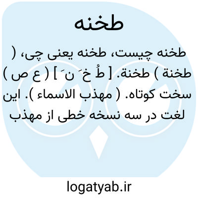 ( طخنة ) طخنة. [ طُ خ َ ن َ ] ( ع ص ) سخت کوتاه. ( مهذب الاسماء ). این لغت در سه نسخه خطی از مهذب الاسماء بدین صورت در «باب الطاء المضمومة مع الخاء» ثبت شده، ولی صاحب تاج العروس در ماده طحن در ضمن مستدرکات گوید: قال الزجاج: الطخته، القصیر فیه لوثة. و نقل الازهری عن ابن الاعرابی اذا کان الرجل نهایة فی القصر، فهو الطخته. ( و در تاج العروس کلمه طختة بدون اعراب است ).
