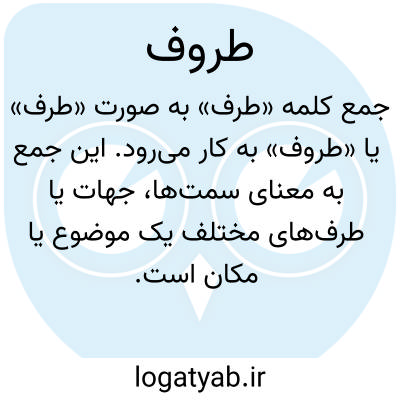 جمع کلمه «طرف» به صورت «طُرُف» یا «طُروف» به کار می‌رود. این جمع بیشتر در زبان رسمی و نوشتاری دیده می‌شود و به معنای سمت‌ها، جهات یا طرف‌های مختلف یک موضوع یا مکان است. برای مثال می‌توان گفت: «طُرُف مختلف اتاق را با چراغ روشن کردند»، که منظور تمام جهات و گوشه‌های اتاق است.