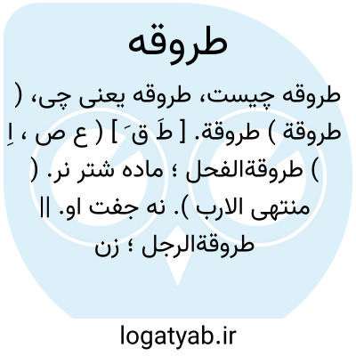 ( طروقة ) طروقة. [ طَ ق َ ] ( ع ص، اِ ) طروقةالفحل؛ ماده شتر نر. ( منتهی الارب ). نه جفت او. || طروقةالرجل؛ زن مرد. ( منتهی الارب ). نه همسر او. و منه: کان یصبح جنباً من غیر طروقة. ( منتهی الارب ). || ناقة طروقةالفحل؛ به وقتی رسید ناقه که نر داده شود آن را و کذلک المراءة.( منتهی الارب ). ماده ای که جوان شود و رغبت نر کند.