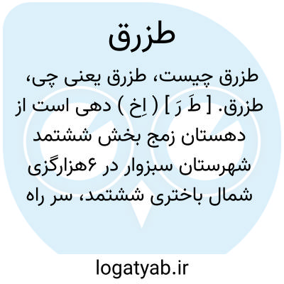 طزرق. [ طَ رَ ] ( اِخ ) دهی است از دهستان زمج بخش ششتمد شهرستان سبزوار در 6هزارگزی شمال باختری ششتمد، سر راه مالرو عمومی استاج. کوهستانی و معتدل با 426 تن سکنه. آب آن از رودخانه و قنات و محصول آنجا غلات و پنبه و بادام و میوه. شغل اهالی زراعت و باغداری و کرباس و چادرشب بافی و راه آن مالرو است. ( از فرهنگ جغرافیایی ایران ج 9 ).