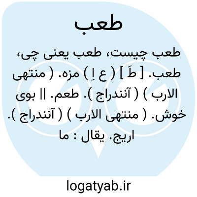 طعب. [ طَ ] ( ع اِ ) مزه. ( منتهی الارب ) ( آنندراج ). طعم. || بوی خوش. ( منتهی الارب ) ( آنندراج ). اریج. یقال: ما به من الطعب شی ٔ؛ ای من اللذة و الطیب. ( منتهی الارب ).