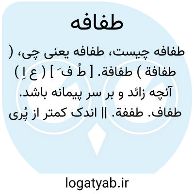 ( طفافة ) طفافة. [ طُ ف َ ] ( ع اِ ) آنچه زائد و بر سر پیمانه باشد. طفاف. طففة. || اندک کمتر از پُری پیمانه. ( منتهی الارب ).