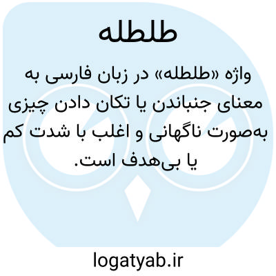 واژه «طلطله» در زبان فارسی به معنای جنباندن یا تکان دادن چیزی بهصورت ناگهانی و اغلب با شدت کم یا بیهدف است. این واژه معمولاً در ادبیات محاورهای یا نوشتاری برای توصیف حرکتهای کوچک و گاه بیمعنی اجسام یا حتی افراد بهکار میرود. به عبارت دیگر، وقتی چیزی را به شکلی میلرزانیم یا میجنبانیم، میتوان گفت آن را «طلطله» کردهایم.