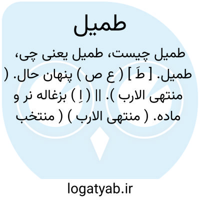 طمیل. [ طَ ] ( ع ص ) پنهان حال. ( منتهی الارب ). || ( اِ ) بزغاله نر و ماده. ( منتهی الارب ) ( منتخب اللغات ). جدی و عناق. ( فهرست مخزن الادویه ). || بوریا. ( منتهی الارب ). حصیر. ( منتخب اللغات ). || آب و لای آمیخته. ( منتهی الارب ). لای تک ِ حوض. ( منتخب اللغات ). || خار خرمابن.( منتهی الارب ). || پیکان پهن. ( منتهی الارب ) ( منتخب اللغات ). || گردن بند بدان جهت که به بوی خوش بیالایند آنرا. || ( ص ) نان فراخ و پهن. || تیر خون آلود. ( منتهی الارب ).