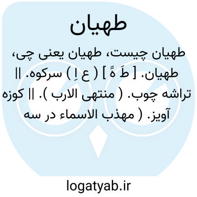 لغت نامه دهخدا طهیان. [ طَ هََ ] ( ع اِ ) سرکوه. || تراشه چوب. ( منتهی الارب ). || کوزه آویز. ( مهذب الاسماء در سه نسخه خطی ).طهیان. [ طَهَْ / طَ هََ ] ( اِخ ) کوهی است. ( منتهی الارب ). نام قله کوهی است در یمن. ( از معجم البلدان ).