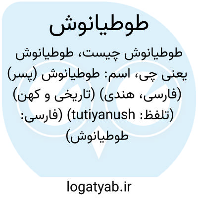 اسم: طوطیانوش (پسر) (فارسی، هندی) (تاریخی و کهن) (تلفظ: tutiyanush) (فارسی: طوطیانوش) (انگلیسی: tutiyanush)
