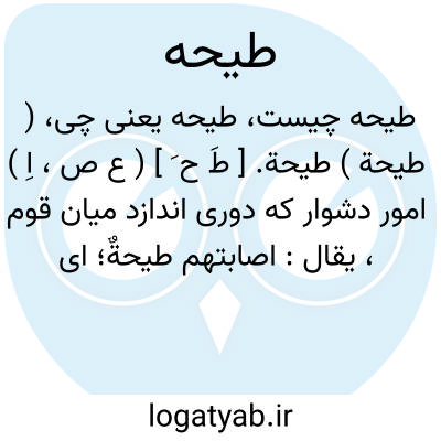 ( طیحة ) طیحة. [ طَ ح َ ] ( ع ص، اِ ) امور دشوار که دوری اندازد میان قوم، یقال: اصابتهم طیحةٌ؛ ای امور فرّقت بینهم. ( منتهی الارب ) ( آنندراج ).
