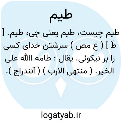 طیم. [ طَ ] ( ع مص ) سرشتن خدای کسی را بر نیکوئی. یقال: طامه اﷲ علی الخیر. ( منتهی الارب ) ( آنندراج ). مصدر «طامه اﷲ علی الخیر»؛ ای جبله. ( تاج المصادر بیهقی ). || نیکوکار شدن. یقال: طام فلان. ( منتهی الارب ) ( آنندراج ).