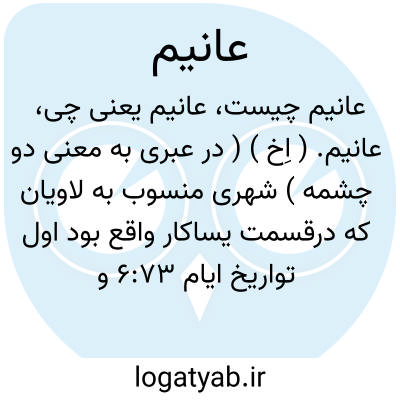 عانیم. ( اِخ ) ( در عبری به معنی دو چشمه ) شهری منسوب به لاویان که درقسمت یساکار واقع بود اول تواریخ ایام 6:73 و بعضی را گمان چنان است که عانیم همان عین جنیم است. صحیفه یوشع 19:21 و 1:29. یعنی جنین که بجانب چمن بنی عمیر واقع است ملاحظه در عین جنیم. ( قاموس کتاب مقدس ).