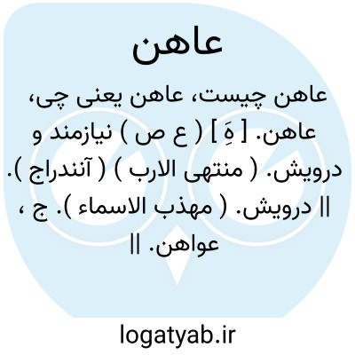 عاهن. [ هَِ ] ( ع ص ) نیازمند و درویش. ( منتهی الارب ) ( آنندراج ). || درویش. ( مهذب الاسماء ). ج، عواهن. || حاضر و مقیم ثابت. || فروهشته اندام سست. || ( اِ ) شترخانه زاد. || شاخ خرمابن که نزدیک تنه باشد. ( منتهی الارب ) ( آنندراج ). زلو خرما. ( مهذب الاسماء ). || رگ زهدان ماده شتر. || عضوو جوارح مردم. ( منتهی الارب ) ( آنندراج ). ج، عواهن.