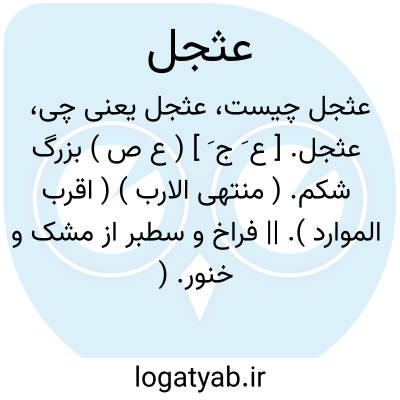 عثجل. [ ع َ ج َ ] ( ع ص ) بزرگ شکم. ( منتهی الارب ) ( اقرب الموارد ). || فراخ و سطبر از مشک و خنور. ( منتهی الارب ). الواسع الضخم من الاوعیة و الاسقیة و نحوها. ( اقرب الموارد ).