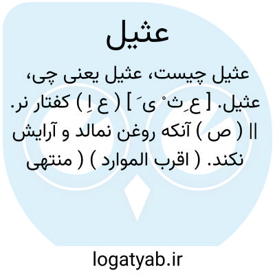 عثیل. [ ع ِث ْ ی َ ] ( ع اِ ) کفتار نر. || ( ص ) آنکه روغن نمالد و آرایش نکند. ( اقرب الموارد ) ( منتهی الارب ) ( آنندراج ).