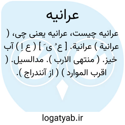 ( عرانیة ) عرانیة. [ ع ُ ی َ ] ( ع اِ ) آب خیز. ( منتهی الارب ). مدالسیل. ( اقرب الموارد ) ( از آنندراج ). || میانه دریا. ( منتهی الارب ) ( آنندراج ). || آنچه موج از تک آب برآرد. ( اقرب الموارد ) ( منتهی الارب ) ( آنندراج ). || بسیاری آب. ( منتهی الارب ) ( از آنندراج ).