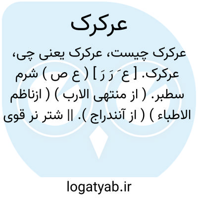 عرکرک. [ ع َ رَ رَ ] ( ع ص ) شرم سطبر. ( از منتهی الارب ) ( ازناظم الاطباء ) ( از آنندراج ). || شتر نر قوی درشت. ( منتهی الارب ). شتر قوی و درشت، و مؤنث آن عرکرکة باشد. ( از اقرب الموارد ). || مرد تندار و شکیبا. ( منتهی الارب ) ( آنندراج ). || شتر که از خراش آرنج، بازویش بریده باشد. ( منتهی الارب ). شتری که پهلوی او بوسیله آرنجش خط افتاده و بریده باشد و تا گوشت رسیده باشد. ( از اقرب الموارد ).