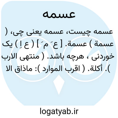 ( عسمة ) عسمة. [ ع َ م َ ] ( ع اِ ) یک خوردنی، هرچه باشد. ( منتهی الارب ). أکلة. ( اقرب الموارد ): ماذاق الا عسمة؛ نچشید مگر یک خوردنی را. ( از اقرب الموارد ) ( از منتهی الارب ). || پاره نان خشک. ( منتهی الارب ). ج، عَسْم، و عُسوم. ( منتهی الارب ).