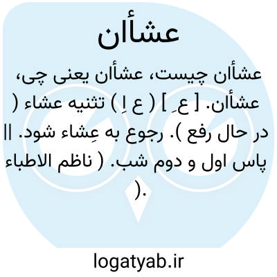 لغت نامه دهخدا عشأان. [ ع ِ ] ( ع اِ ) تثنیه عشاء ( در حال رفع ). رجوع به عِشاء شود. || پاس اول و دوم شب. ( ناظم الاطباء ). مغرب و عتمة. ( اقرب الموارد ).