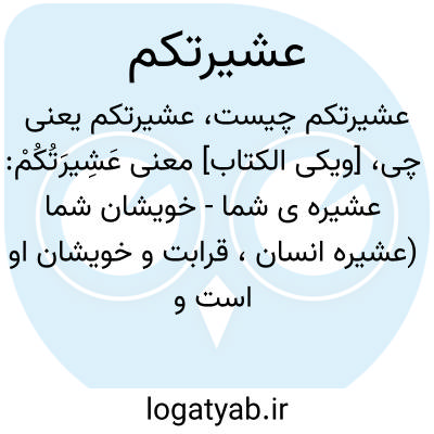 دانشنامه اسلامی [ویکی الکتاب] معنی عَشِیرَتُکُمْ: عشیره ی شما - خویشان شما (عشیره انسان، قرابت و خویشان او است و اگر خویشاوندان آدمی را عشیره خواندهاند، از این باب است که با آدمی معاشرت دارند و آدمی با آنان معاشرت میکند)ریشه کلمه: عشر (۲۷ بار)کم (۲۲۹۱ بار)