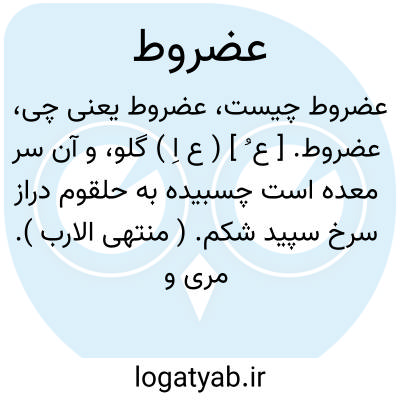 عضروط. [ ع ُ ] ( ع اِ ) گلو، و آن سر معده است چسبیده به حلقوم دراز سرخ سپید شکم. ( منتهی الارب ). مری و سرخ روده. ( ناظم الاطباء ). مری ءالحلق؛ و آن سر معده باشد که به حلقوم متصل و چسبیده است و سرخ و مستطیل است و داخل آن سفید. ( از اقرب الموارد )( از تاج العروس ). || مزدور. ( منتهی الارب ).اجیر. ( اقرب الموارد ). || خادم و بدنبال کس رونده. ( منتهی الارب ). عُضارط. ( اقرب الموارد ). و رجوع به عضارط شود. ج، عَضاریط. ( از اقرب الموارد ).