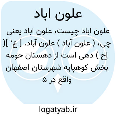 ( علون آباد ) علون آباد. [ ع ُ ]( اِخ ) دهی است از دهستان حومه بخش کوهپایه شهرستان اصفهان واقع در 5 هزارگزی شمال کوهپایه و 5 هزارگزی شمال راه شوسه اصفهان به یزد. ناحیه ایست کوهستانی و دارای آب و هوای معتدل. سکنه آن 720 تن است. آب آن از قنات تأمین میشود. محصول آن غلات است. اهالی به زراعت اشتغال دارند. راه آن ماشین رو است. این ده دارای دبستان است. ( از فرهنگ جغرافیایی ایران ج 10 ).