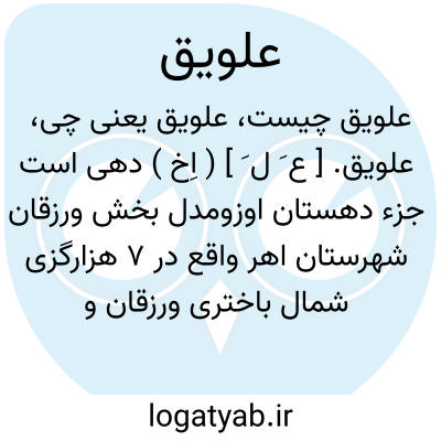علویق. [ ع َ ل َ ] ( اِخ ) دهی است جزء دهستان کلیبر بخش کلیبر شهرستان اهر واقع در 21 هزارگزی جنوب کلیبر و 2 هزارگزی راه شوسه اهر به کلیبر. ناحیه ایست کوهستانی و دارای آب و هوای معتدل.سکنه آن 136 تن است. آب آن از چشمه تأمین میشود. محصول آن غلات است. اهالی به زراعت و گله داری اشتغال دارند و صنایع دستی آنها جاجیم بافی و گلیم بافی است. دارای راه مالرو است. ( فرهنگ جغرافیایی ایران ج 4 ).