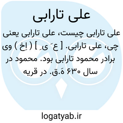 علی تارابی. [ ع َ ی ِ ] ( اِخ ) وی برادر محمود تارابی بود. محمود در سال 630 هَ.ق. در قریه تاراب از توابع بخارا به مخالفت با لشکر جغتای خان قیام کرد و چون به زهد و تقوی مشهور بود عده بسیاری از مریدانش به وی پیوستند. در جنگی که بین لشکر جغتای خان و مریدان محمود درگرفت، محمود کشته شد اما کسی از آن حال خبر نیافت و مریدان فکر کردندکه او غیبتی کرده است از این رو برادرانش محمد و علی را به حکومت برداشتند. اما اینان نیز در جنگ با سپاه مغول کشته شدند. ( از حبیب السیر چ خیام ج 3 ص 79 ).