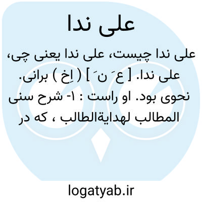 علی ندا. [ ع َ ن َ ] ( اِخ ) برانی. نحوی بود. او راست: 1- شرح سنی المطالب لهدایةالطالب، که در محرم سال 1291 هَ. ق. از تألیف آن فراغت یافت. 2- ضوابط الرسم فی ایضاح الرقم. ( از معجم المؤلفین ).
