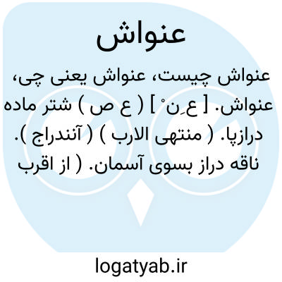 عنواش. [ ع ِن ْ ] ( ع ص ) شتر ماده درازپا. ( منتهی الارب ) ( آنندراج ). ناقه دراز بسوی آسمان. ( از اقرب الموارد ).