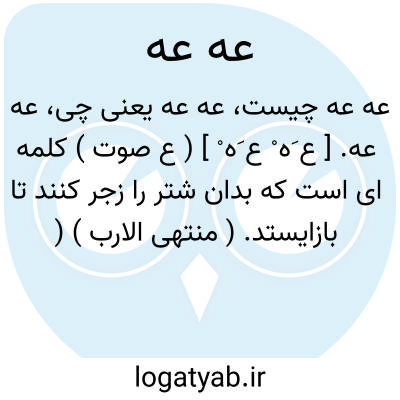 عه عه. [ ع َه ْ ع َه ْ ] ( ع صوت ) کلمه ای است که بدان شتر را زجر کنند تا بازایستد. ( منتهی الارب ) ( آنندراج ) ( ناظم الاطباء ). اسم صوت است که بوسیله آن شتران زجر میشوند تا حبس گردند. ( از اقرب الموارد ). || در تداول عامه فارسی زبانان صورتی از اَه ْاَه ْ صوت تنفر و انزجار است.