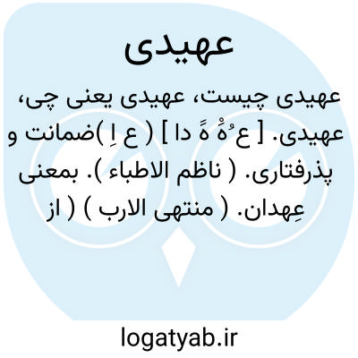 لغت نامه دهخدا عهیدی. [ ع ُهَْ هََ دا ] ( ع اِ )ضمانت و پذرفتاری. ( ناظم الاطباء ). بمعنی عِهدان. ( منتهی الارب ) ( از اقرب الموارد ). رجوع به عهدان شود.