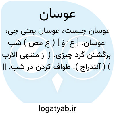 عوسان. [ ع َ وَ ] ( ع مص ) شب برگشتن گرد چیزی. ( از منتهی الارب ) ( آنندراج ). طواف کردن در شب. || کوشیدن و رنج بردن جهت عیال. || قوت دادن به عیال. ( از اقرب الموارد ). عَوس. رجوع به عَوس شود.