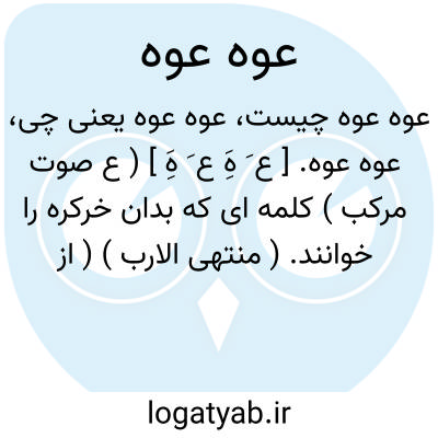 لغت نامه دهخدا عوه عوه. [ ع َ هَِ ع َ هَِ ] ( ع صوت مرکب ) کلمه ای که بدان خرکره را خوانند. ( منتهی الارب ) ( از اقرب الموارد ).