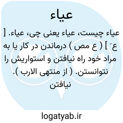 عیاء. [ ع َ ] ( ع ص ) داء عیاء؛بیماریی که بِه نشود. ( منتهی الارب ) ( آنندراج ) ( ناظم الاطباء ). بیماریی که بهبودی در آن نباشد. ( از اقرب الموارد ). || فحل عیاء؛ گشن درمانده از گشنی، یا آنکه طرز گشنی نداند و گاهی گشنی نکرده باشد،و نیز رجل عیاء به همین دو معنی است. ( از منتهی الارب ) ( از آنندراج ) ( از ناظم الاطباء ). نر و یا مردی که نزدیکی با ماده را نداند و یا نری که هرگز نزدیکی به ماده نکرده باشد. ( از ذیل اقرب الموارد از لسان ).