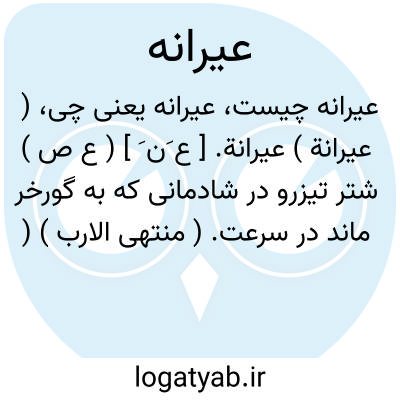 ( عیرانة ) عیرانة. [ ع َن َ ] ( ع ص ) شتر تیزرو در شادمانی که به گورخر ماند در سرعت. ( منتهی الارب ) ( آنندراج ) ( از ناظم الاطباء ). شتری که در سرعت و جنب وجوش چون گورخر باشد، و گویند ماده شتر تیزرو در حال جنب وجوش. ( از اقرب الموارد ).