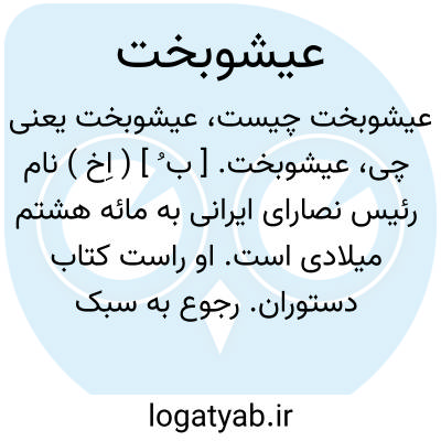 لغت نامه دهخدا عیشوبخت. [ ب ُ ] ( اِخ ) نام رئیس نصارای ایرانی به مائه هشتم میلادی است. او راست کتاب دستوران. رجوع به سبک شناسی ج 1 ص 51 و ایران در زمان ساسانیان ص 76 شود.