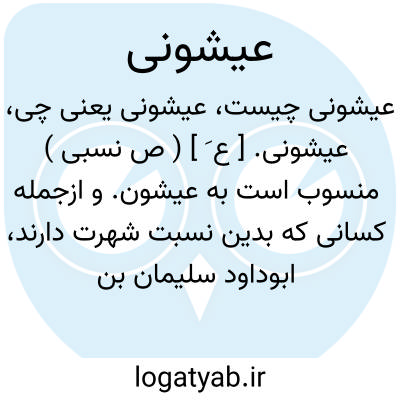 عیشونی. [ ع َ ] ( ص نسبی ) منسوب است به عیشون. و ازجمله کسانی که بدین نسبت شهرت دارند، ابوداود سلیمان بن فیروزبن عبداﷲ خیاط عیشونی وابوجعفر عبداﷲبن محمدبن عیشون حرانی عیشونی هستند که هر دو از محدثانند. ( از اللباب فی تهذیب الانساب ).