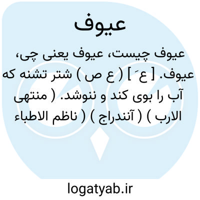 عیوف. [ ع َ ] ( ع ص ) شتر تشنه که آب را بوی کند و ننوشد. ( منتهی الارب ) ( آنندراج ) ( ناظم الاطباء ). شتر که آب صاف را ببوید و در حالی که تشنه است آن را ترک گوید. ( از اقرب الموارد ). || زنی که شیرش بند گردد بعداز زاییدن و بمکد زن دیگر تا سوراخ پستان وی گشاده گردد. ( منتهی الارب ) ( آنندراج ) ( ناظم الاطباء ). رجوع به عیفة شود. || مرد بسیارکراهت. ( منتهی الارب ) ( آنندراج ) ( ناظم الاطباء ). || ( اِخ ) نام زنی است. ( منتهی الارب ) ( آنندراج ) ( ناظم الاطباء ).