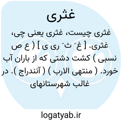غثری. [ غ َ ث َ ری ی ] ( ع ص نسبی ) کشت دشتی که از باران آب خورد. ( منتهی الارب ) ( آنندراج ). در غالب شهرستانهای ایران دیم و دیمی گویند. العثری بالعین المهملة. ( اقرب الموارد ).