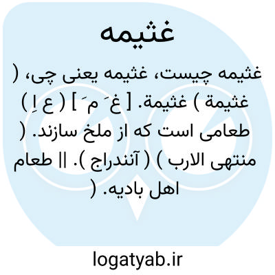 ( غثیمة ) غثیمة. [ غ َ م َ ] ( ع اِ ) طعامی است که از ملخ سازند. ( منتهی الارب ) ( آنندراج ). || طعام اهل بادیه. ( مهذب الاسماء ). || ( مص ) کارزار کردن. با هم خصومت کردن. ( منتهی الارب ).