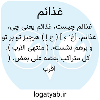 لغت نامه دهخدا غذائم. [غ َ ءِ ] ( ع اِ ) هرچیز تو بر تو و برهم نشسته. ( منتهی الارب ). کل متراکب بعضه علی بعض. ( اقرب الموارد ).غذائم. [ غ َ ءِ ] ( ع اِ ) ج ِ غذیمة. ( اقرب الموارد ).