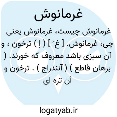 غرمانوش. [ غ َ ] ( اِ ) ترخون، و آن سبزی باشد معروف که خورند. ( برهان قاطع ) ( آنندراج ). ترخون و آن تره ای است، و به جای میم، باء موحده نیز گفته اند. ( فرهنگ رشیدی ). || بیخ حشیشی است کوهی که آن را عاقرقرحا خوانند. ( برهان قاطع ) ( آنندراج ) ( جهانگیری ). رجوع به عاقرقرحا شود.